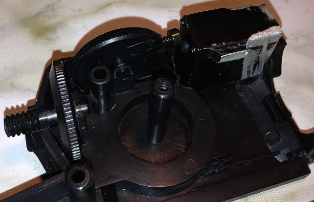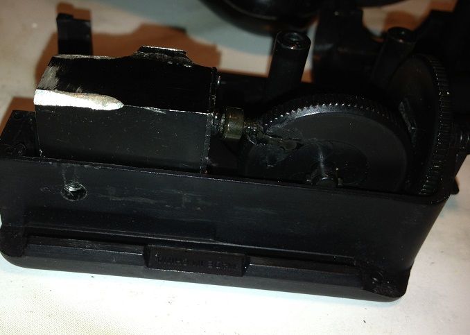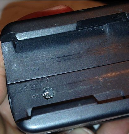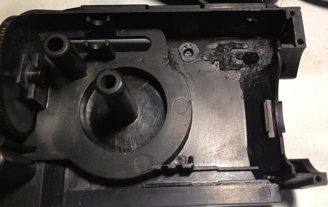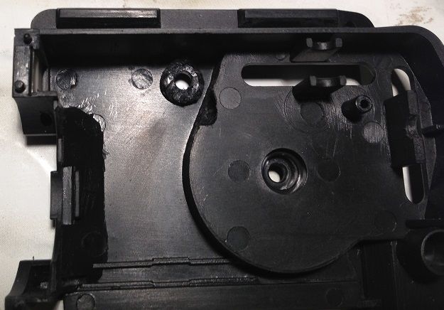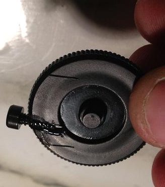 After ensuring the fitment was correct, I pulled out the little free-flying disc that looks like an adjustment knob. I marked some reference cuts on the sides to get an idea for how much room I have to work with, and then market off the area closest to the switch on the back of the laser. My plan was to make this into a functioning of and on switch for the laser light. I dremeled into it deep enough to fit a screw into it as a bumper to activate the switch. Then I recycled the screw that belonged to the bracket I removed from inside. I also doused it with a good lot of super glue for measure.